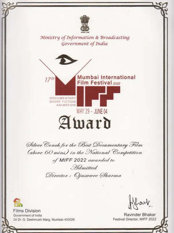 • Best National Documentary (Above 60 minutes) Silver Conch at MIFF 2022 by Films Division, Ministry of Information and Broadcasting, Government of India.