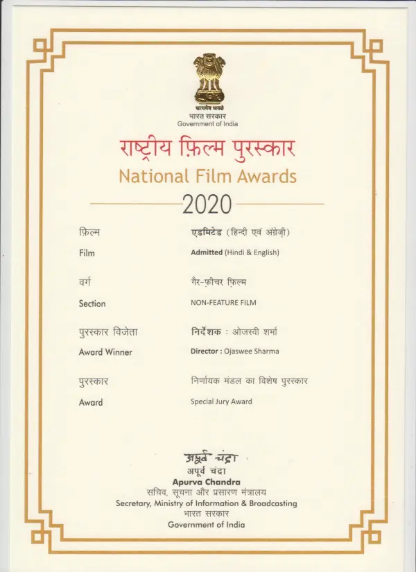 • Special Jury Award and ‘Rajat Kamal’ at 68th National Film Awards from the 15th President of Republic of India and the Ministry of Information & Broadcasting, Government of India, for Film: Admitted.
